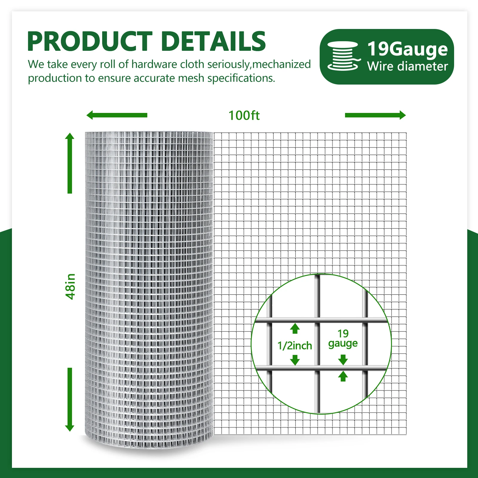 1/2x48x100ft Hardware Cloth 19-Gauge Welded Galvanized Mesh Roll for Hog Wire Fences, Greenhouse Flooring & Crawl Space Covers