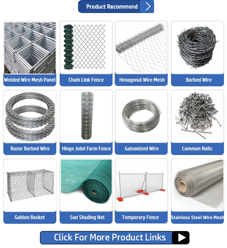 1. Who are we? We are based in Hebei, China, start from 2012,sell to Eastern Asia(35.00%),Oceania(20.00%),North America(10.00%),South America(10.00%),Mid East(10.00%),Africa(6.00%),Domestic Market(5.00%),Europe(5.00%). There are total about 51-100 people in our office. 2. How can we guarantee quality? Always a pre-production sample before mass production; Always final Inspection before shipment; 3.What can you buy from us? Barbed Wire/Hexagonal Wire Mesh/Chain Link Fence,Nails 4. Why should you buy from us not from other suppliers? HEBEI SAMSUNG METAL WIRE MESH MANUFACTURE CO.,LTD, established in 1990, is a professional manufacturer engaged in the research, development, production, sale and service of galvanized wire, welded wire mesh, hexagonal wire mesh, chain link fence and so on 5. What services can we provide? Accepted Delivery Terms: FOB,CFR,CIF,EXW; Accepted Payment Currency:USD,EUR,JPY,CAD,AUD,HKD,GBP,CNY,CHF; Accepted Payment Type: T/T,L/C,D/P D/A,Western Union,Cash; Language Spoken:English,Chinese,Japanese