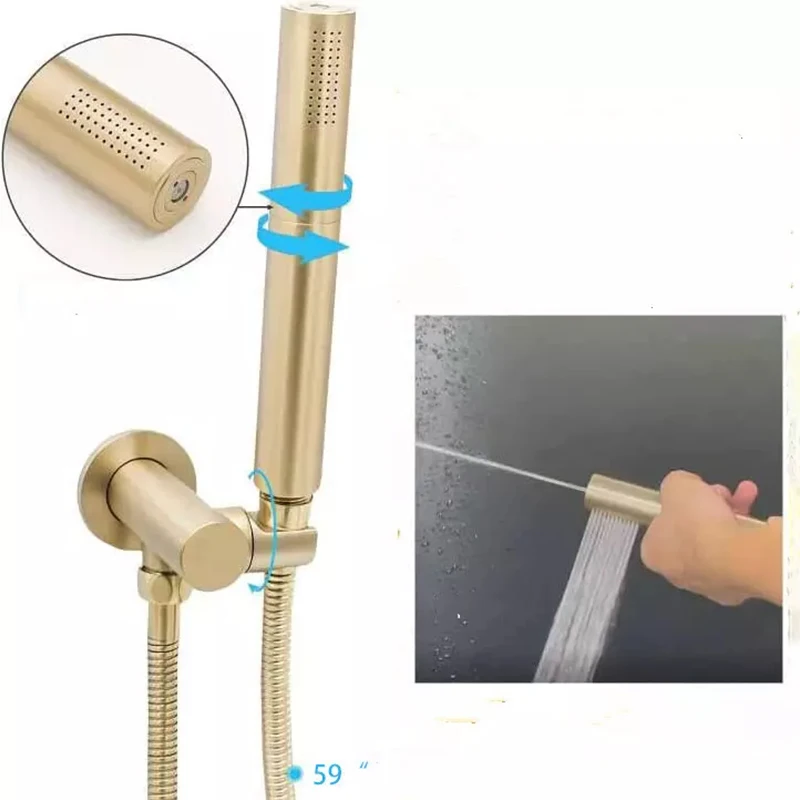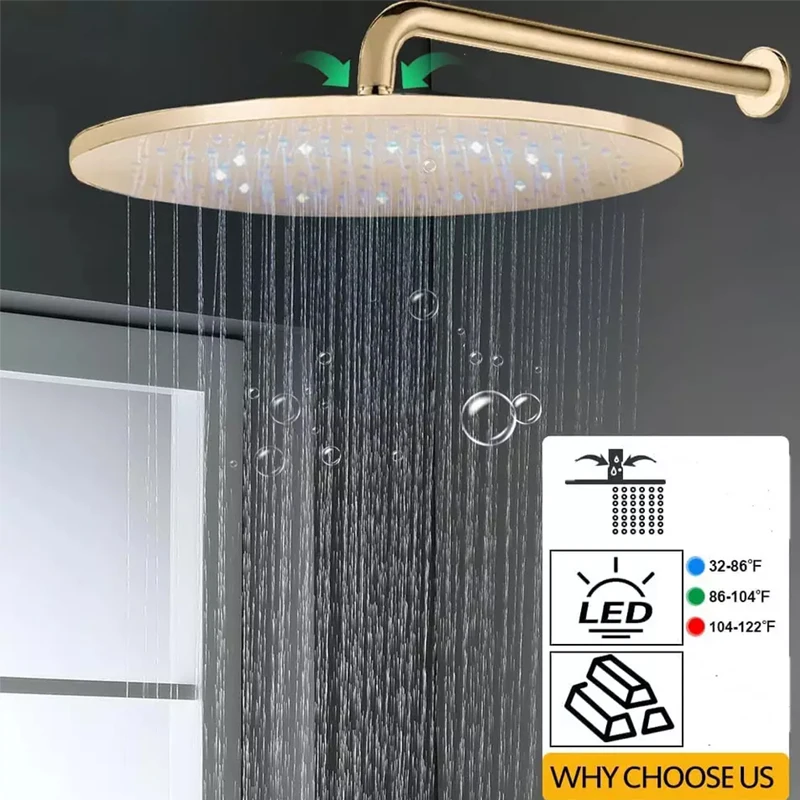 12-Inch Brushed Gold LED Rain Shower Head System Thermostatic Mixer with Single Handle Contemporary Brass Design for Hotels