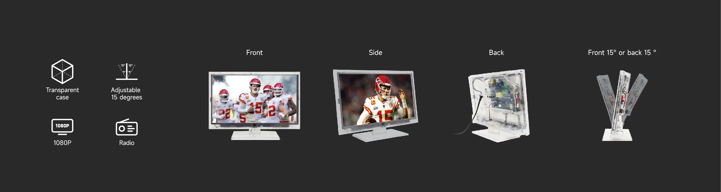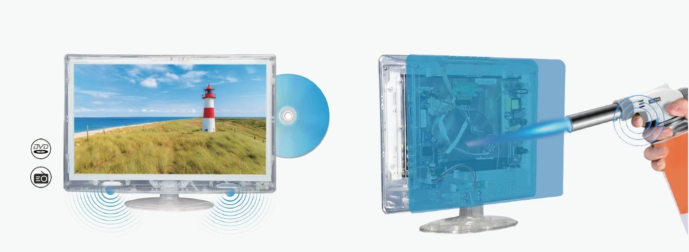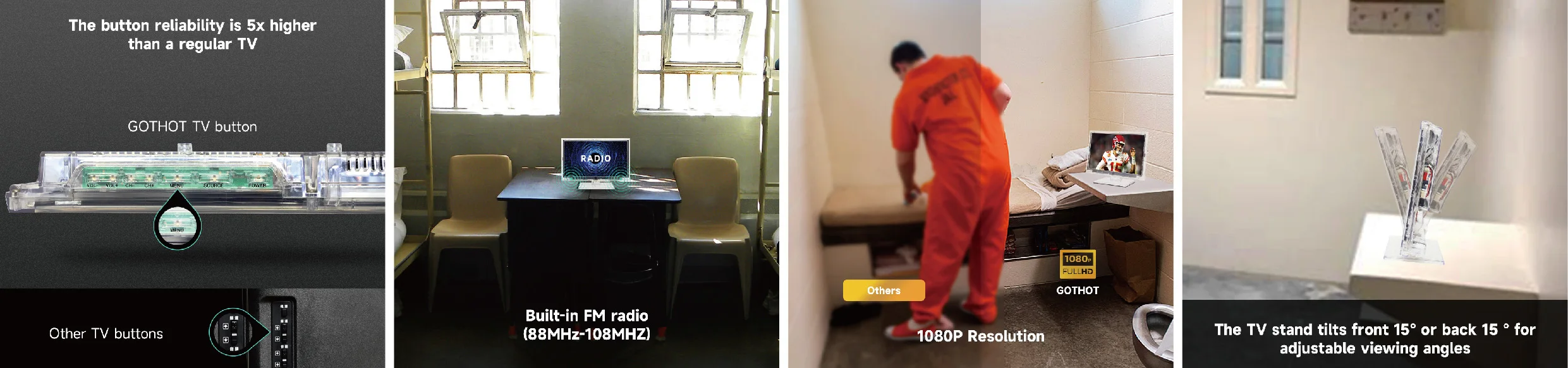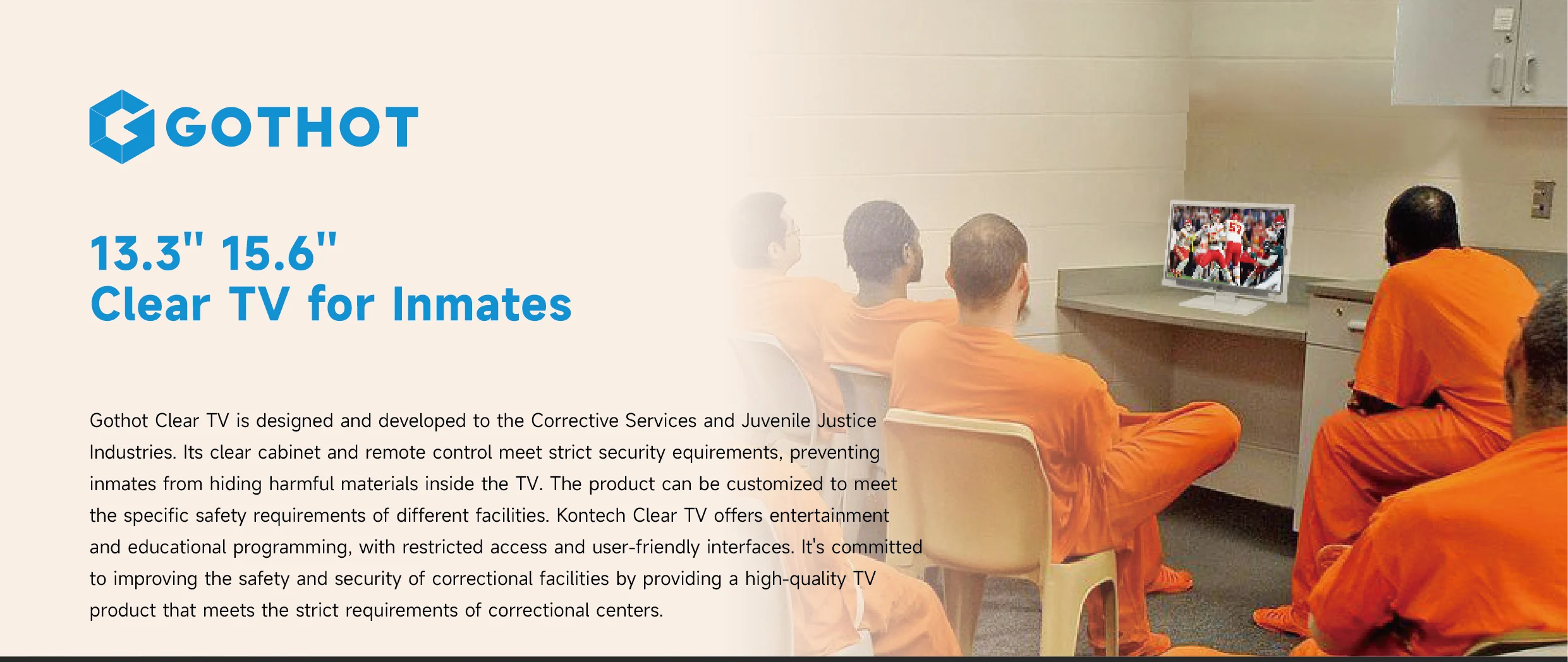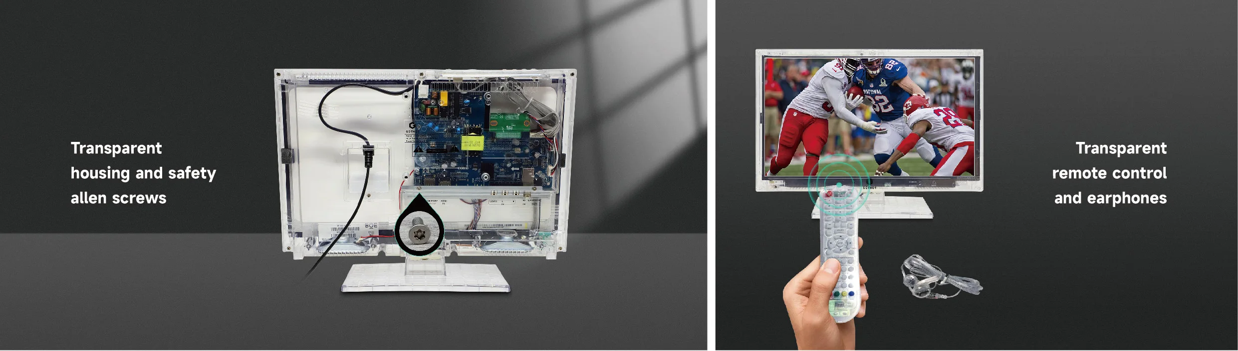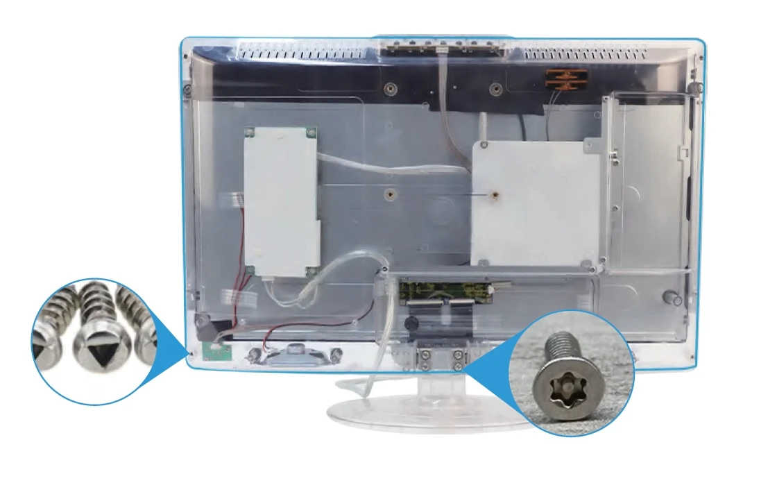 HD Color clear see-through cabinet that allows a complete view of the entire contents of the set’s interior, including electronic circuitry. The security Allen screws help pre-vent inmates tampering the TV or removing parts for illicit purposes, ensuring a safe and secure environ-ment within the facility.