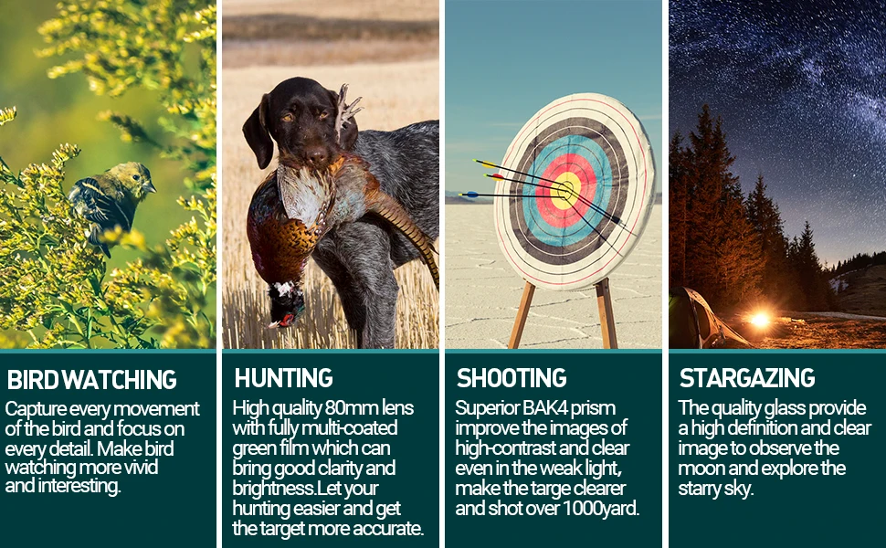 With Advanced Fully Multi-coated 80mm Green Film Glass Lenses, you can enjoy a good clarity and brightness. The quality BAK4 Porro prism optics increases light transmission, delivers bright, clear, high-contrast images even in low-light conditions.