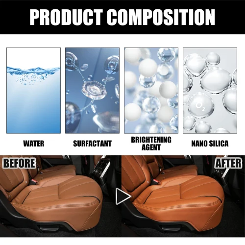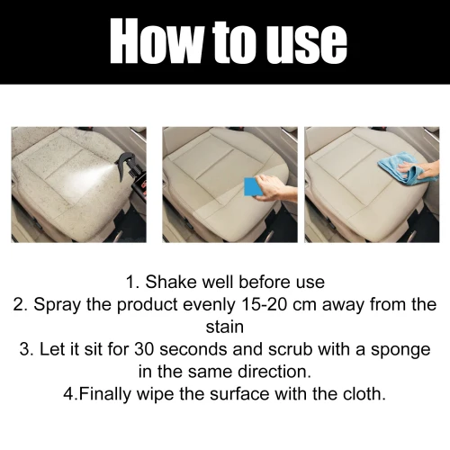 Our coatings contain surfactants, brighteners and nano-silica. It can help prevent fading and cracking caused by ultraviolet light. Its use method is very simple: shake well before use, evenly spray 15-20 cm away from the stain, let it sit for 30 seconds, then scrub with a sponge in the same direction, and finally wipe the surface with a rag. And can clean car stains.