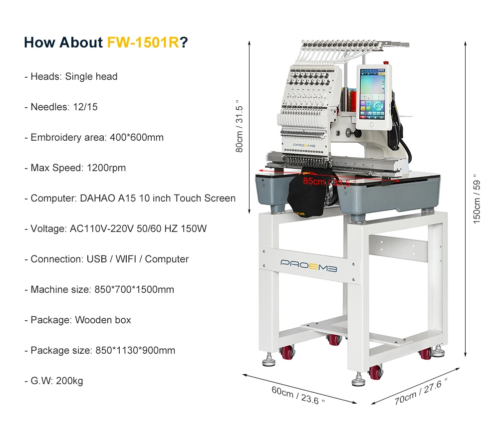 PROEMB FW-1501R Stock in US Home Use Single Head Latest Automatic Computer Cap 3D Computerized Patch Embroidery Machine