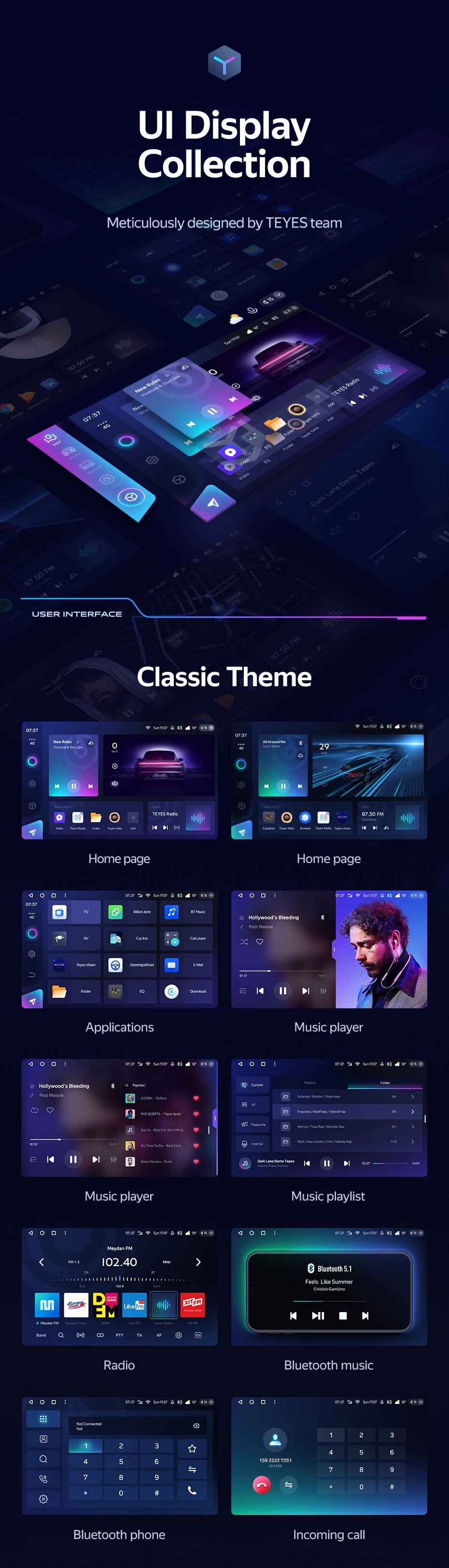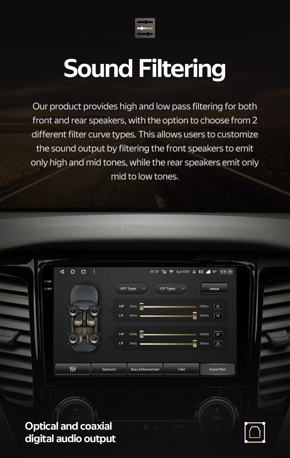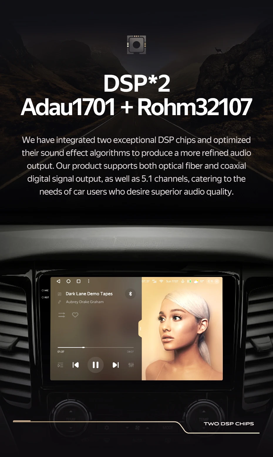 Function: DSP,CarPlay,android auto,App Control,Colorful lights,Steering Wheel Control,Voice Assistant,Power Off Memory
