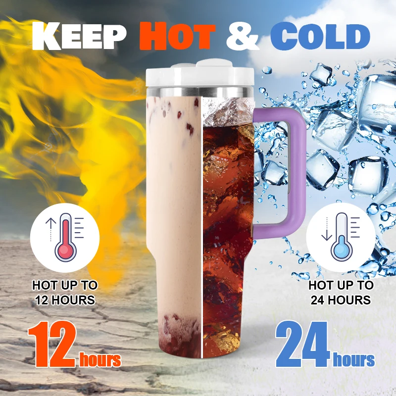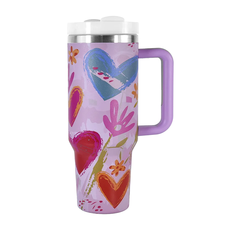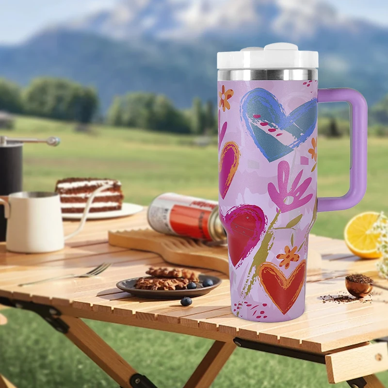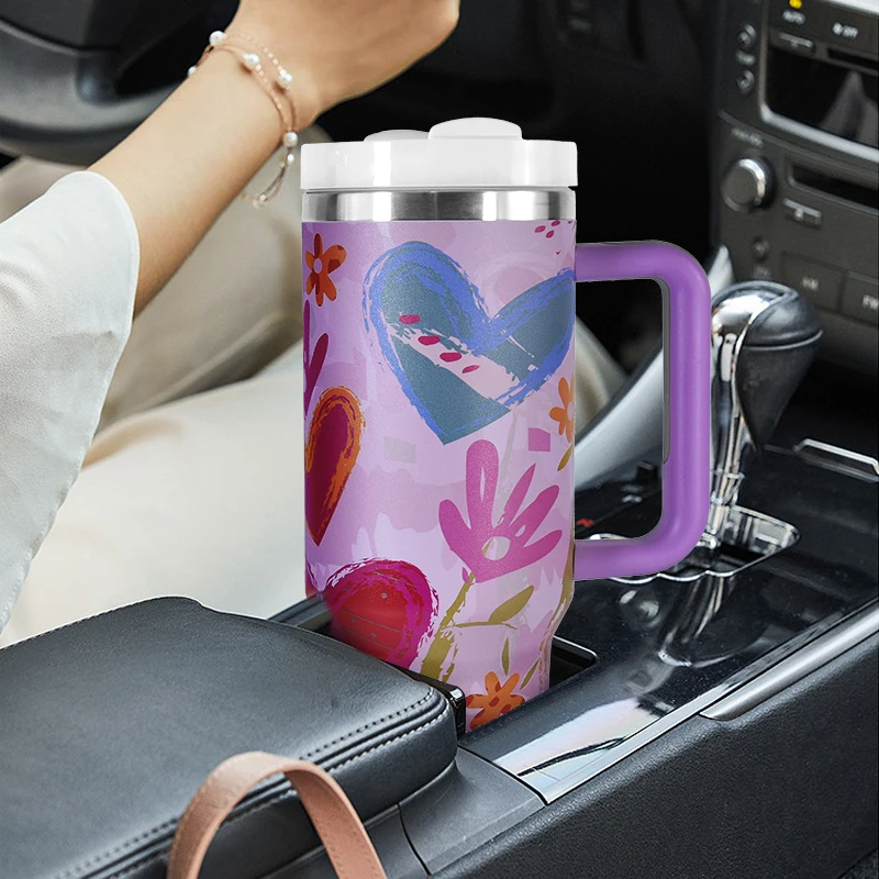 USA Shipped 40oz Stainless Steel Tumbler 3D Printed Pink Flower Travel Mug Luxury Flexible Handle for Hot Cold Beverages