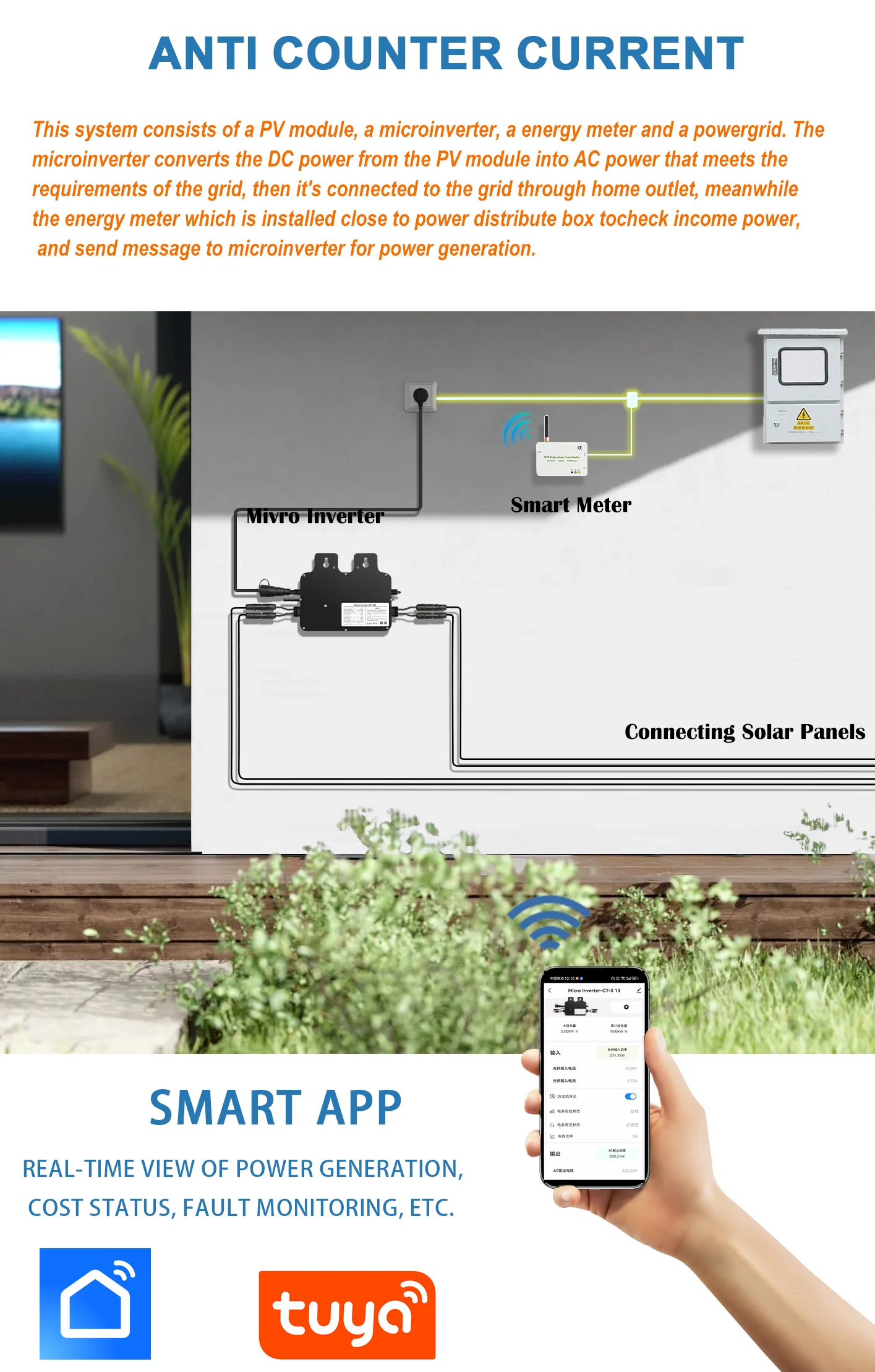 Anti-backflow control box message to micro inverter for output powerlimitation energy by micro inverter will be completely consumed byhousehold appliances in home no more energy go out.